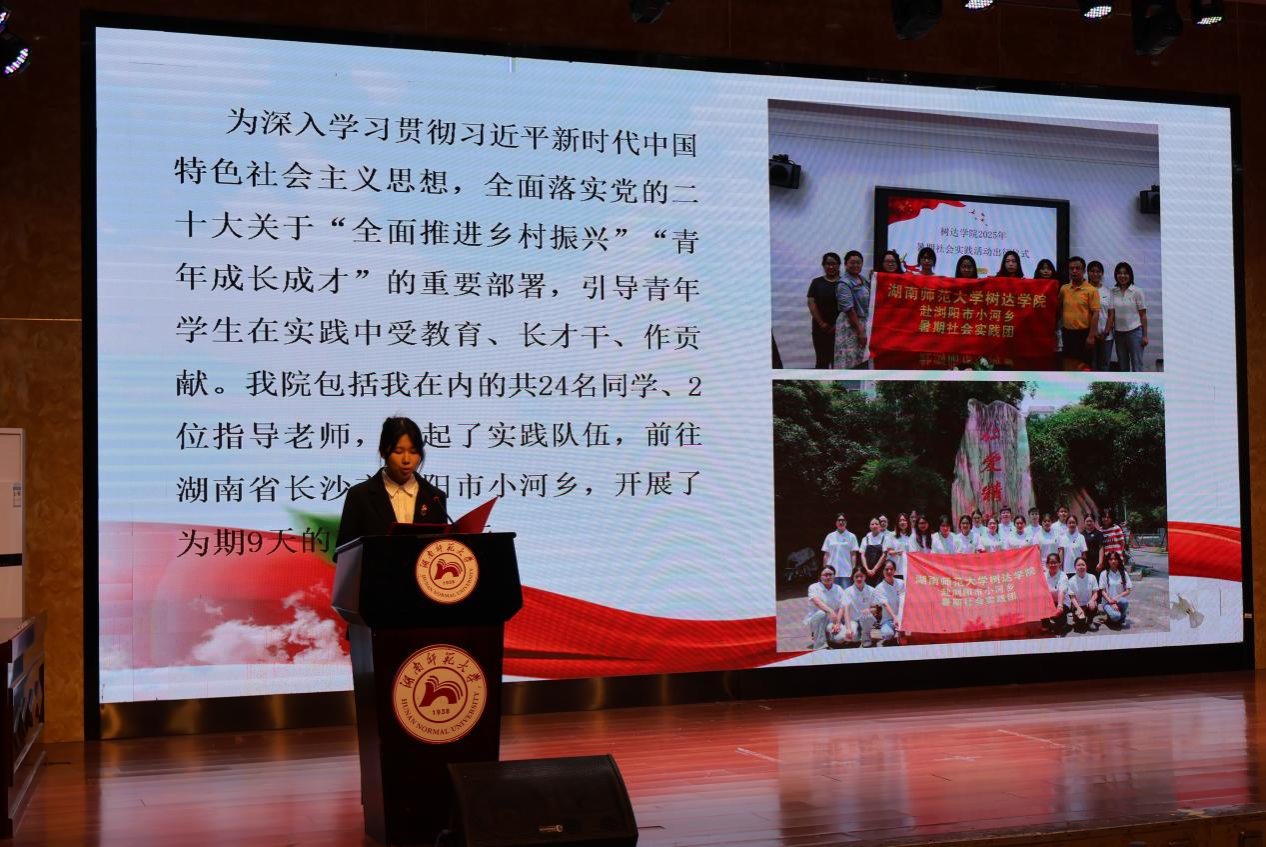 树达学院赴浏阳市小河乡暑期最佳社会实践团代表周李羽檬作实践成果分享。她表示,团队以三线并行的方式聚焦乡村振兴进行调研,开展特色课堂,在服务乡野的同时完成了自我蜕变,为乡村振兴注入了新的活力。