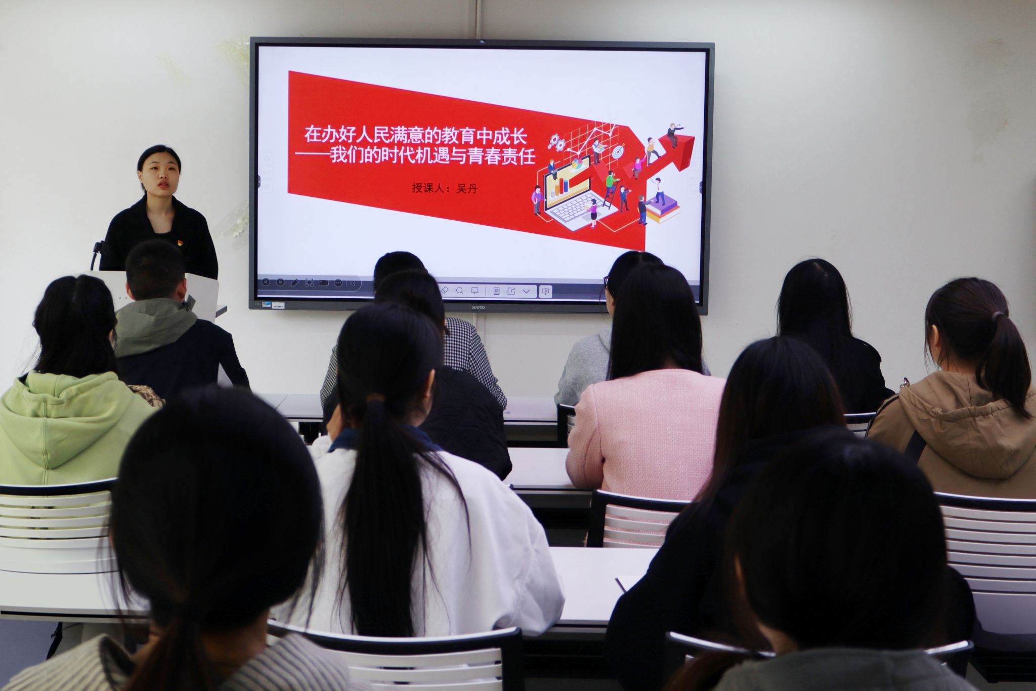 吴丹从“时代之问:何为人民满意的教育?”、“民生之基:教育如何托举我们的未来?”、“青春答卷:吾辈青年何以作为?”三个方面,系统阐述了人民满意教育的时代内涵,以及教育对个人成长与国家发展的重要支撑作用,结合实际案例,激励青年党员把握时代机遇、勇担青春使命。她表示,各党员要深刻理解教育作为国之大计、党之大计的战略意义,积极投身教育强国中。